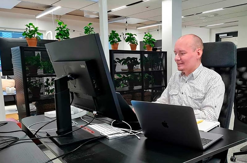Kuva: Jari työskentelemässä twodayn Oulun toimistolla. Pääosin hommat hoituvat kotoa tai twodayn konttorilta käsin, kun asiakas sijaitsee pääkaupunkiseudulla.