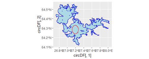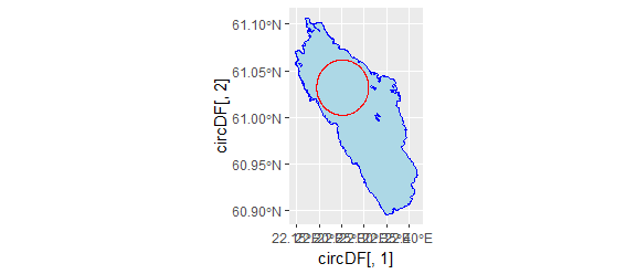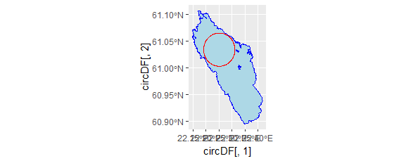 Let’s start by generating a set of points. I’m going to cheat a bit and eyeball the most promising locations on osm.org. (62.153, 29.406) in Saimaa (61.032, 22.252) in Pyhäjärvi and (64.297, 27.211) in Oulujärvi seem like good places to start. Drawing a circle around a point is possible using a query in Openstreetmap. In R code it looks like this: