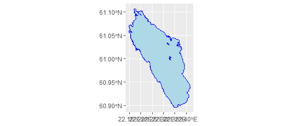 ggplot(data=pyhajarvi$osm_polygons)+ geom_sf(color="blue", fill="lightblue")