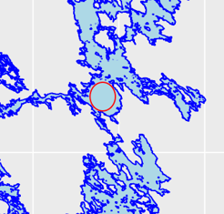 Let’s do the same for Oulujärvi. Starting from 64.297°N, 27.211°E we iterate our way to 64.28459°N, 27.19362°E, which is 4961m from the nearest shore.